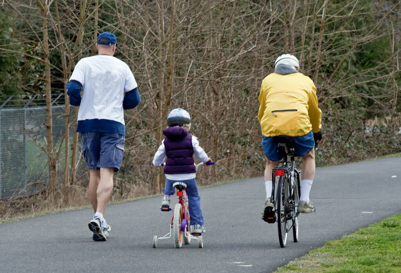 Puedes correr, caminar rápido si no puedes correr, bailar con tus niet@s puede ser muy divertido, jugar al juego de la silla, echar unas canastas en las pistas deportivas, practicar senderismo, montar en bici,… Vete al parque y juega al pilla pilla. Supongo que estarás un poco oxidad@ y los primeros días te dolerá hasta el alma, ¿y lo divertido que puede ser?